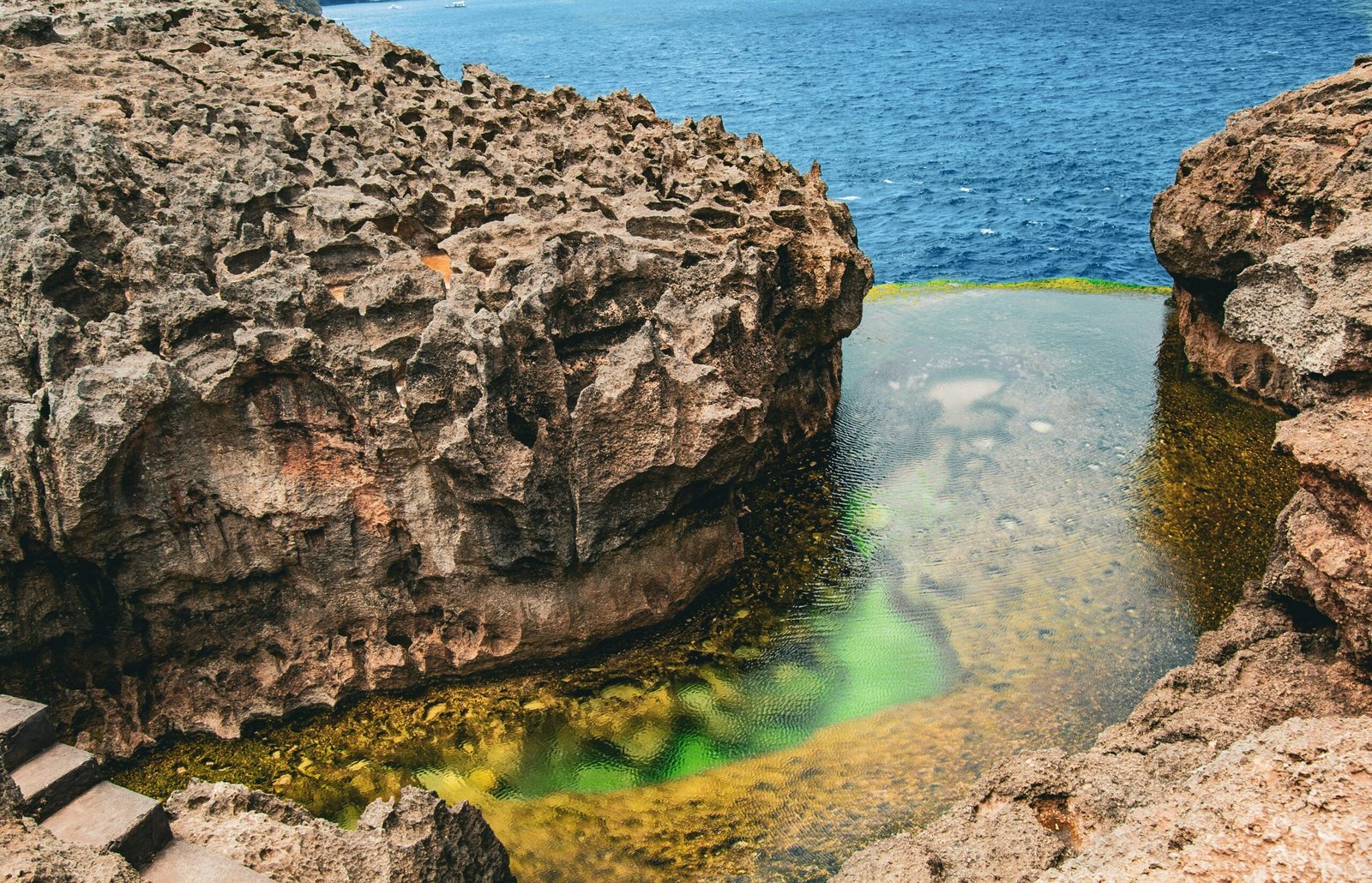 A natural infinity pool formed by crystal-clear tidal water between cliffs. When the tide is low, you can admire its turquoise surface shimmering under the sun.